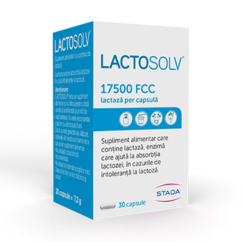 | LACTOSOLV®: Doză și administrare | Luați 1 până la 3 capsule chiar înainte de a consuma alimente și băuturi care conțin lactoză. Dacă aveți probleme la înghițirea capsulei, o puteți deschide și înghiți conținutul întreg, cu apă. O capsulă de LACTOSOLV® descompune aprox. 29 grame de lactoză, echivalent cu conținutul unui jumătate de litru de lapte. Descărcați prospectul. |